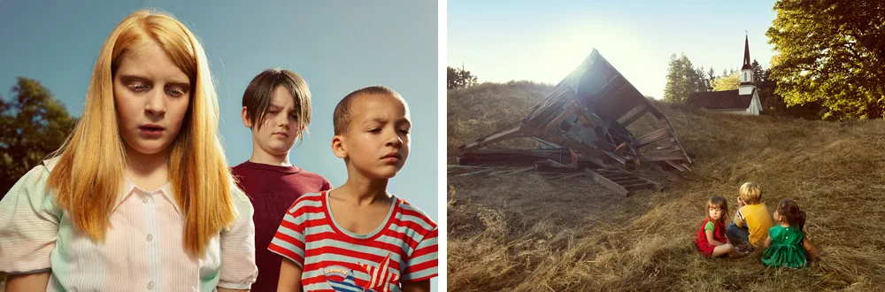 The 12 bright, medium-format color prints at Mann are meant to be seen in the order in which they are hung: The Fall of Spring Hill (2011) is a narrative with a beginning, middle and end based on an incident Holly Andres vaguely remembers from her childhood. Children at a church camp are playing in an elevated wooden structure while their mothers prepare lunch in the church kitchen; the mothers sense imminent danger just as a child falls from the structure. The roused mothers take axes and baseball bats and march determinedly to the playing field, where they proceed to demolish the irresponsible structure.